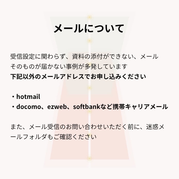 ・hotmail、携帯キャリアメール(ezweb、docomo、softbankなど)は、ご案内メールがお届けできないことがございます。できるだけ、他のアドレスでお申し込みください。