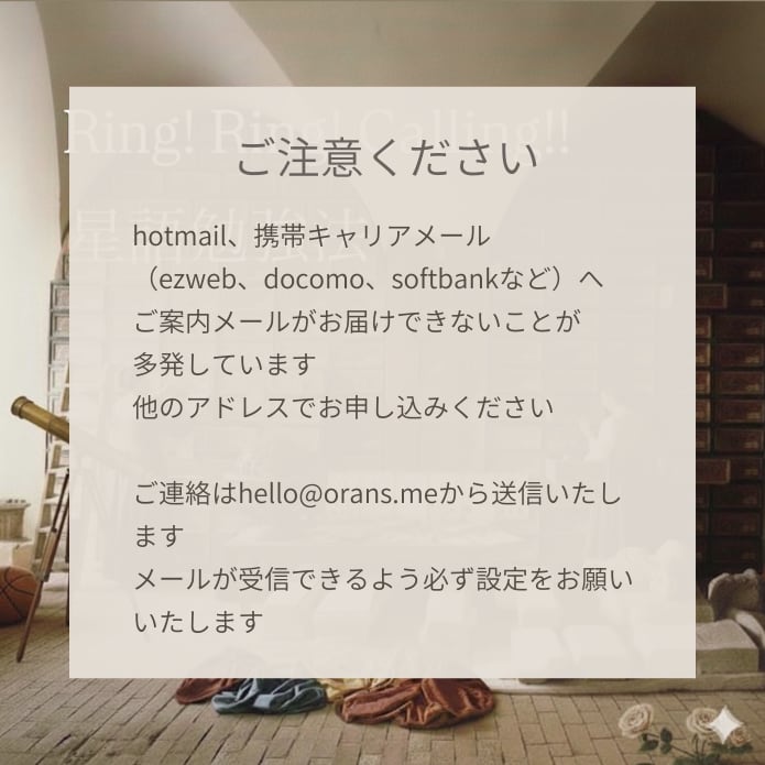 ・hotmail、携帯キャリアメール(ezweb、docomo、softbankなど)は、ご案内メールがお届けできないことがございます。できるだけ、他のアドレスでお申し込みください。