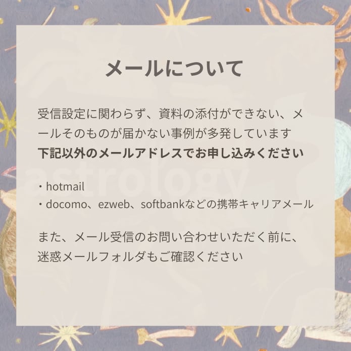 ・hotmail、携帯キャリアメール(ezweb、docomo、softbankなど)は、ご案内メールがお届けできないことがございます。できるだけ、他のアドレスでお申し込みください。