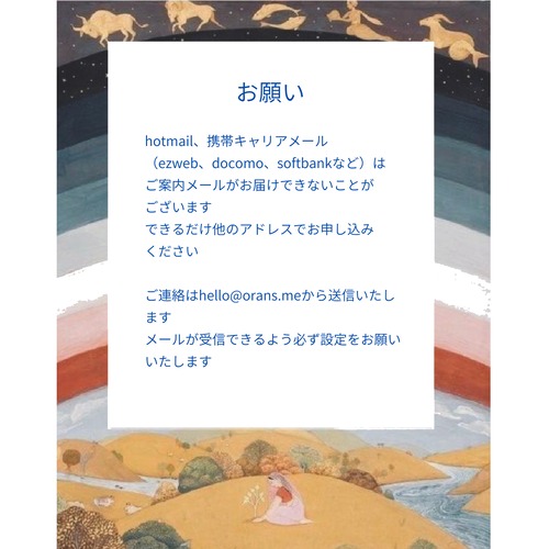 ・hotmail、携帯キャリアメール(ezweb、docomo、softbankなど)は、ご案内メールがお届けできないことがございます。できるだけ、他のアドレスでお申し込みください。